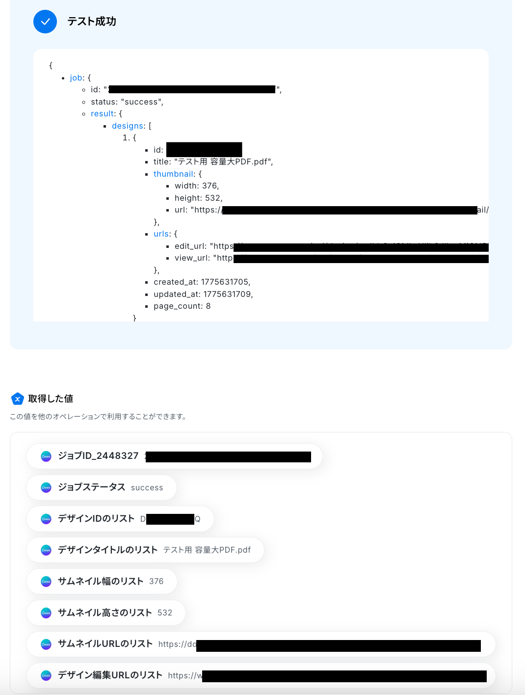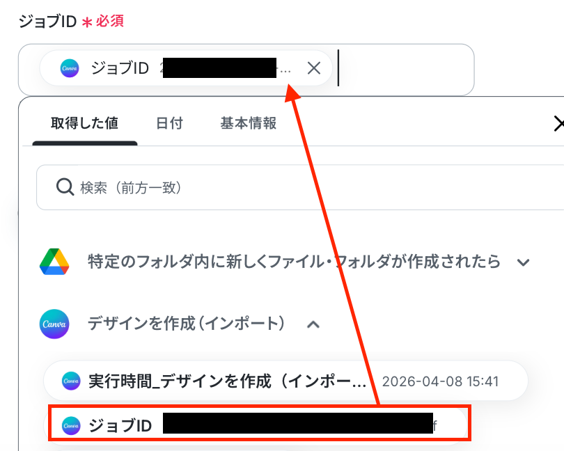 次の画面で「ジョブID」を設定します。 Canvaのアクション設定で取得した値から選択しましょう。