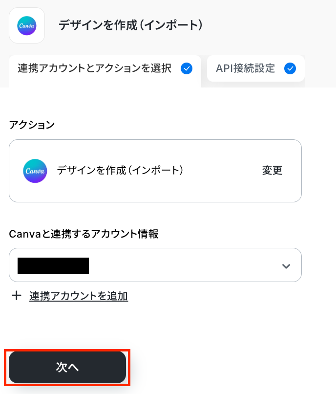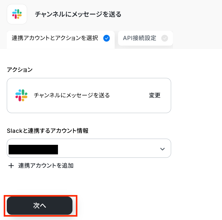 アクションはそのままで、連携するアカウント情報を確認します。 確認したら、「次へ」をクリックしましょう!