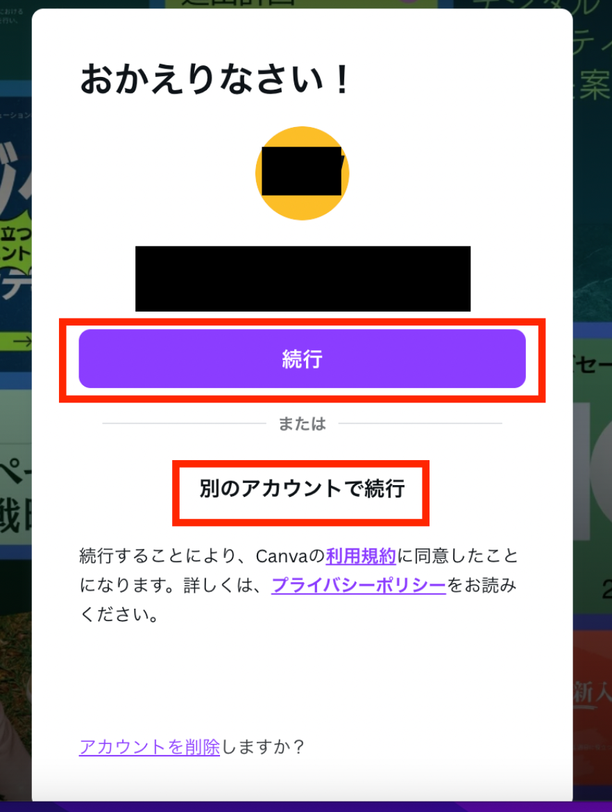 Canvaを検索するとアカウントが表示されるので「続行」もしくは「別のアカウントで続行」を選びます。 (※今回は「続行」からログインをしますね!)
