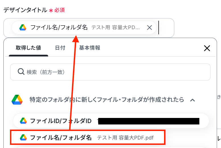 次の画面で、注意事項を確認のうえ、必須項目を設定します。 「デザインタイトル」は、Google Driveのトリガー設定で取得した値を引用して設定することも可能です。【Tips】 取得した値を活用することで、フローボットを起動する度に変動する値として反映されます。 これにより、毎回変動する情報を手動で入力する必要がなくなり、効率的に連携できます!
