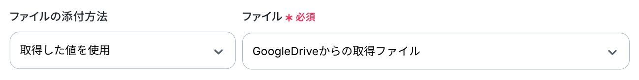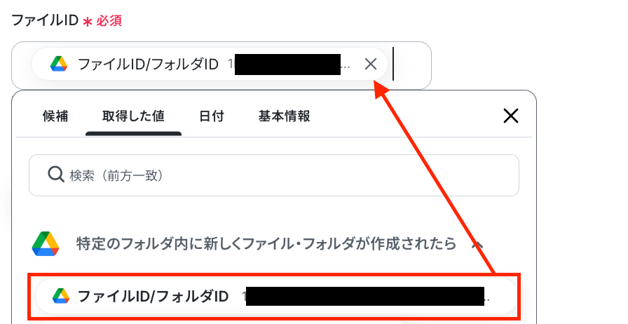 次の画面で、「ファイルID」を設定します。 以下のように、先ほど取得した値から選択してください。