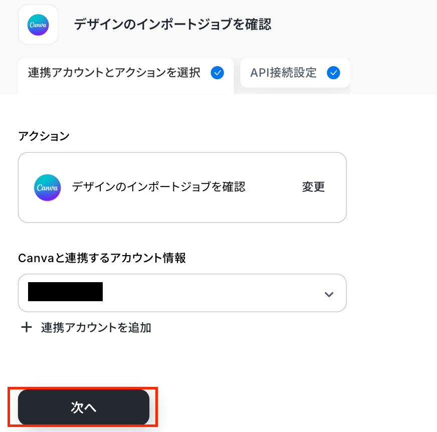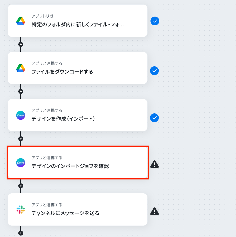ステップ6:Canvaのアクション設定 ここでは、デザインのインポートジョブを確認する設定を行います。 赤枠をクリックしてください。