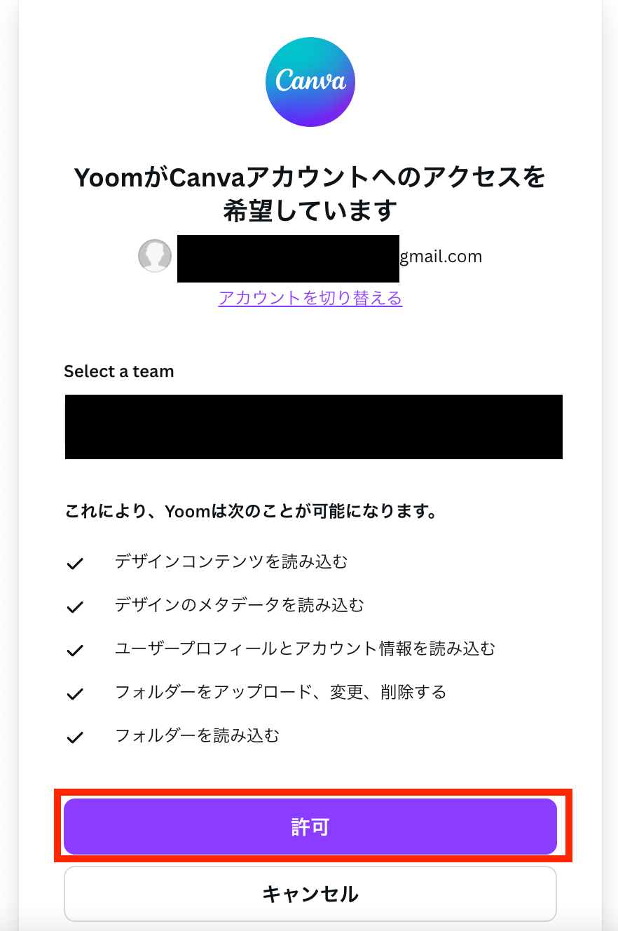 Yoomのアクセス権限のページが表示されるので、内容を確認後「許可」をクリックします。