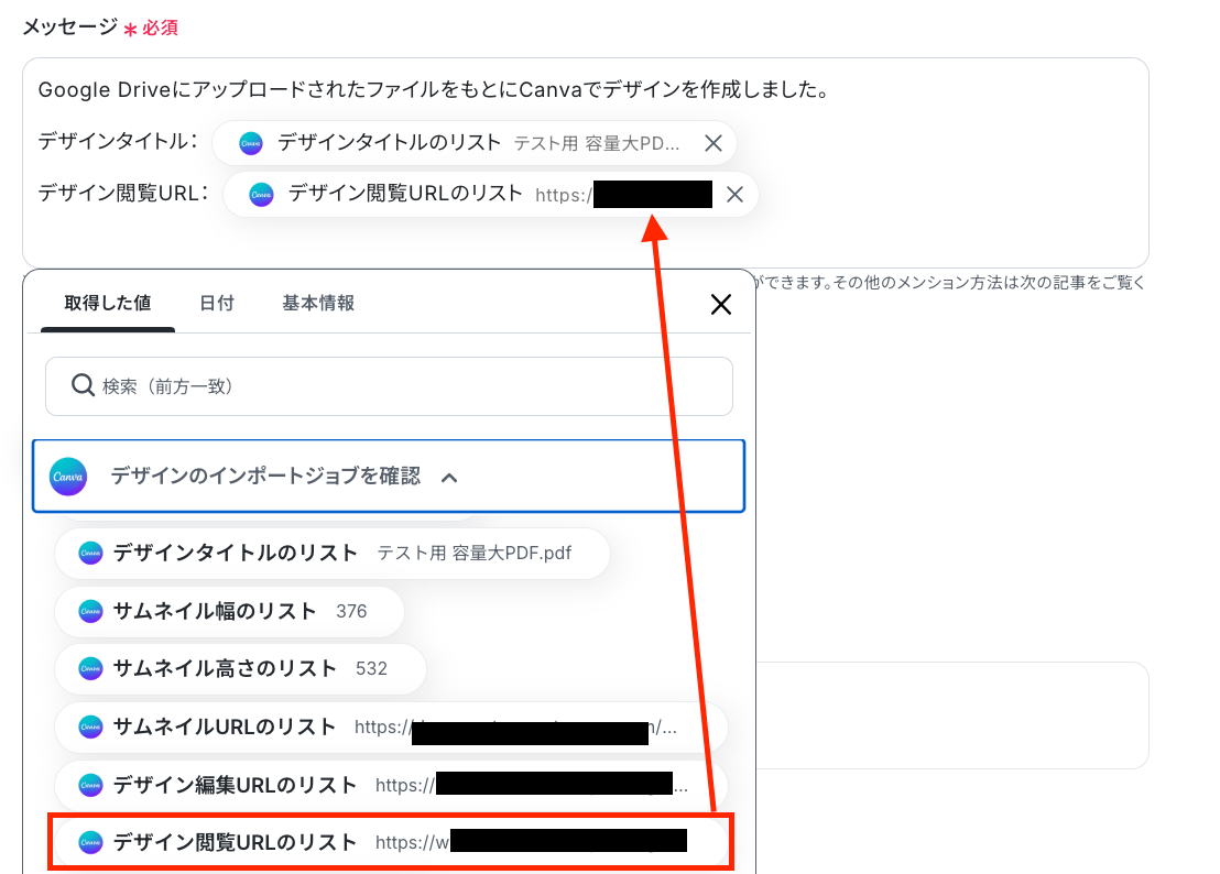 次に、「メッセージ」 を入力します。 以下のように、Canvaのオペレーションで取得した値を引用して設定しましょう。 自由に設定してOKです!