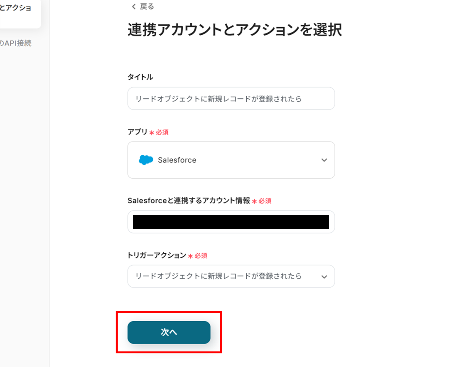 (2)Salesforceの「連携アカウントとアクションを選択」画面から、Salesforceと連携するアカウント情報に誤りがないかを確認し、トリガーアクションは「リードオブジェクトに新規レコードが登録されたら)」のままで「次へ」をクリックします。