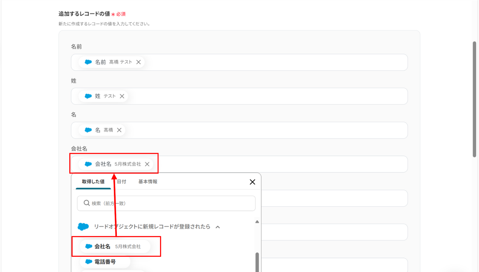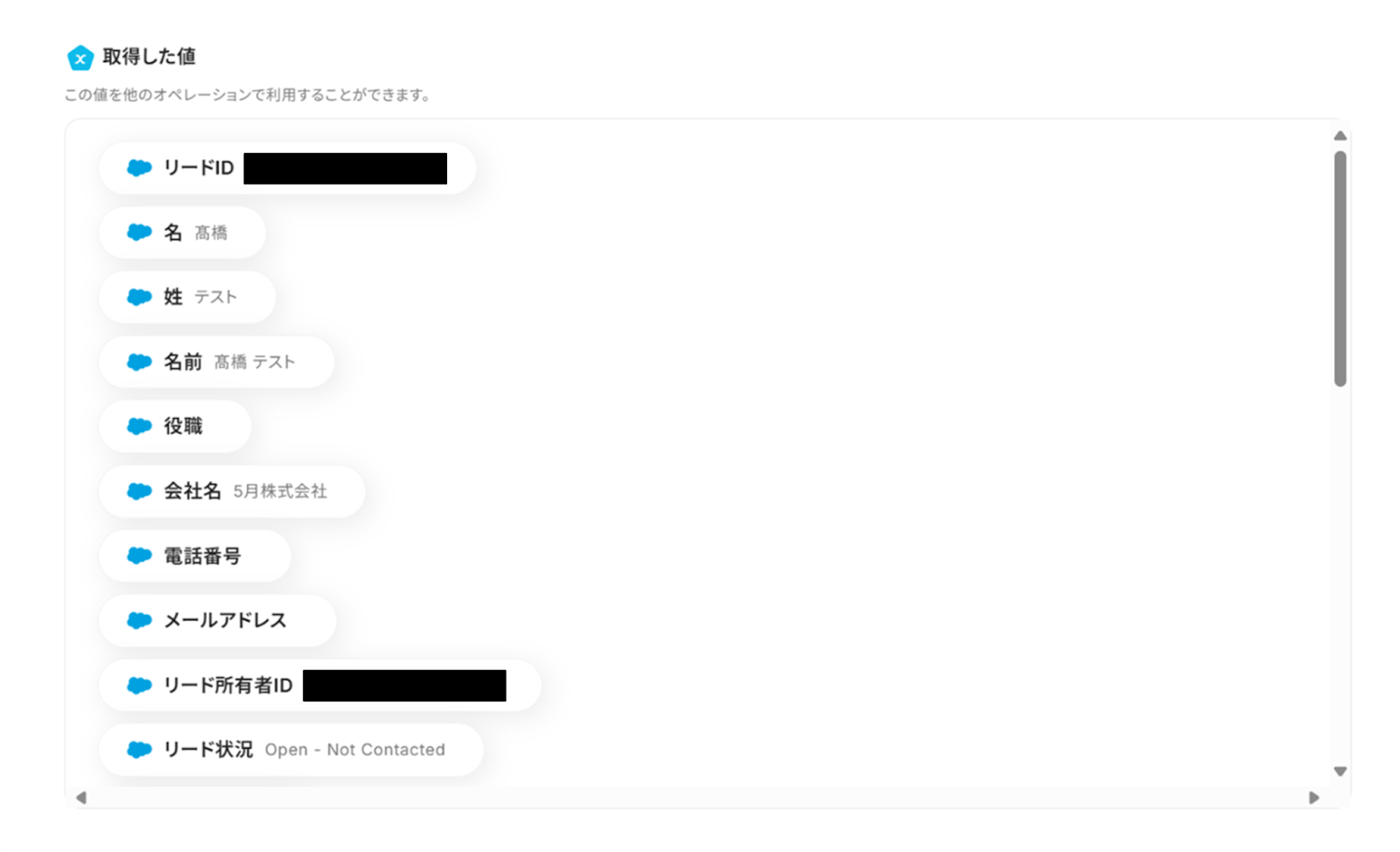 ここで、Salesforceにテスト用としてリードオブジェクトに新規レコードを登録します。 登録が終わったら、フローボットに戻り「テスト」をクリックしましょう。 「取得した値」にSalesforceの情報が反映されればテスト成功です。