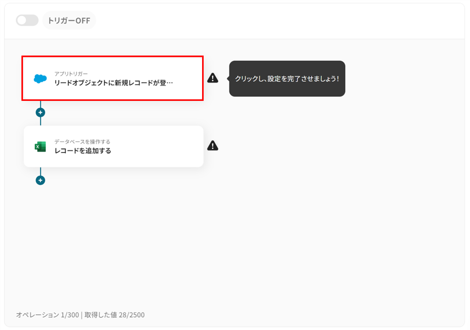 お疲れ様でした!これですべての設定が完了です。 設定が完了すると以下のようなメニューが表示されるので、トリガーをONにします。 実際にフローボットを起動して、Salesforceでリードが登録されたら、Microsoft Excelに自動で追加されているか確認してみてくださいね!