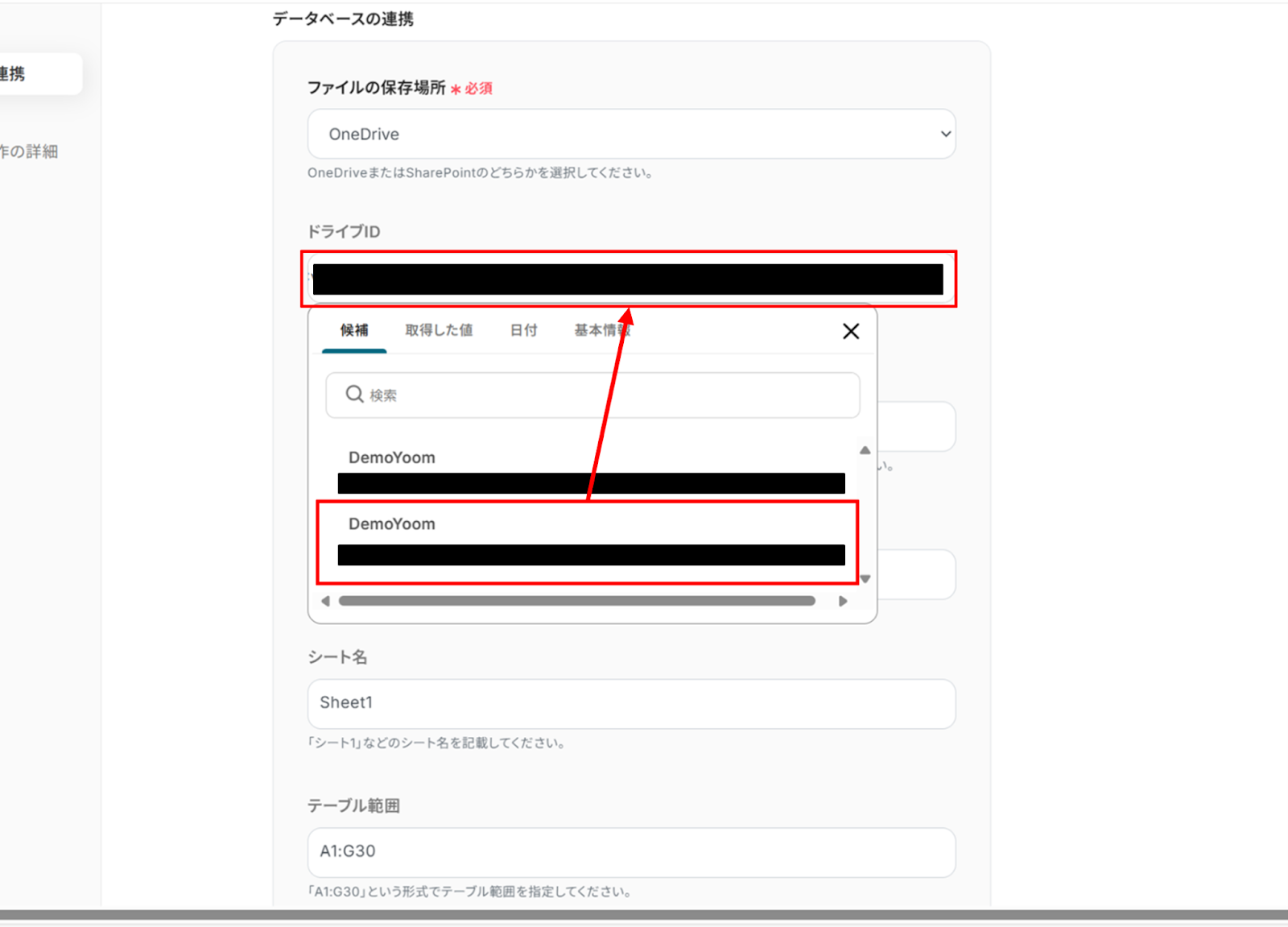 下へ進み、ファイルの保存場所、ドライブID、ファイル名(任意)、アイテムID、シート名、テーブル範囲を入力します。ドライブID、アイテムID、シート名は下の画像のように候補から選択ができます。