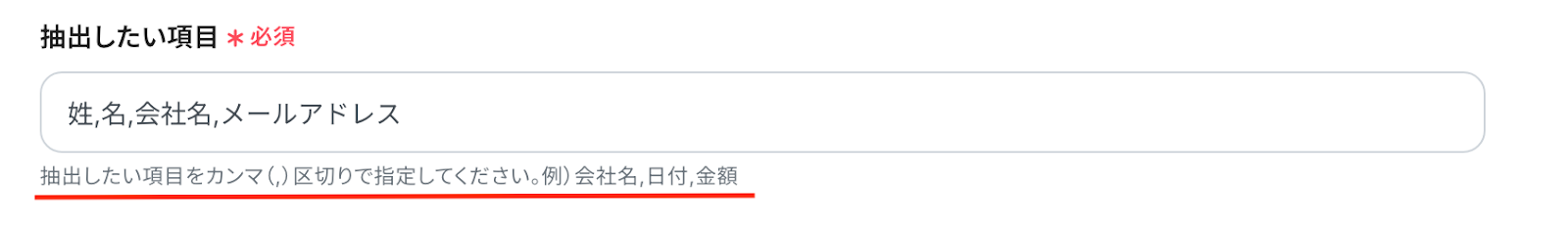 次に、「抽出したい項目」を設定します。 今回は、以下のように設定しました。入力する際は、入力欄下の注釈に沿って入力しましょう。