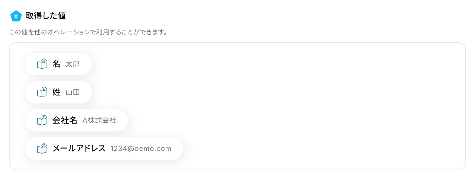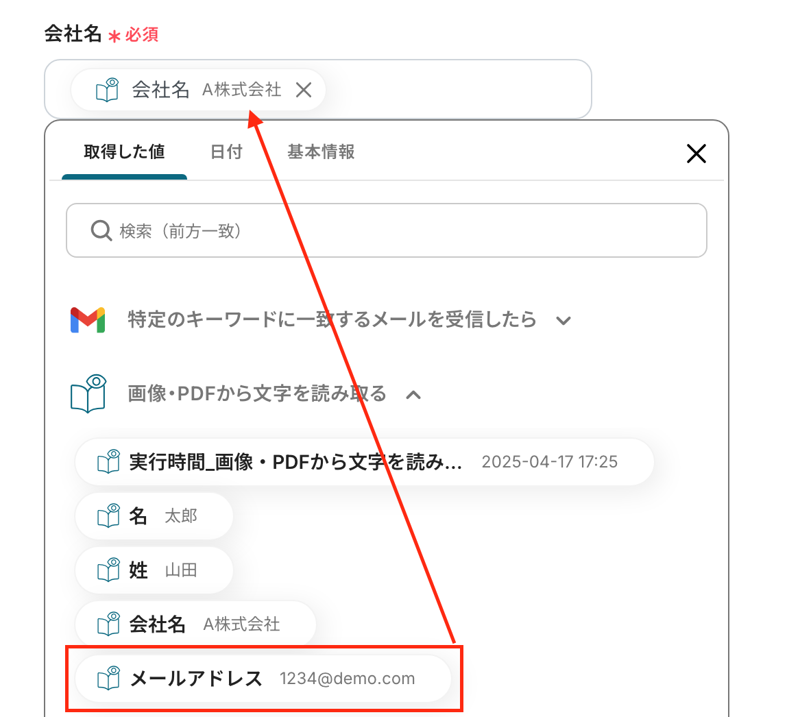ここでは、必須項目を入力しましょう。その他の項目は任意で設定してください。 以下の画像は「会社名」の項目で、入力欄をクリックして表示される「取得した値」から引用したものです。