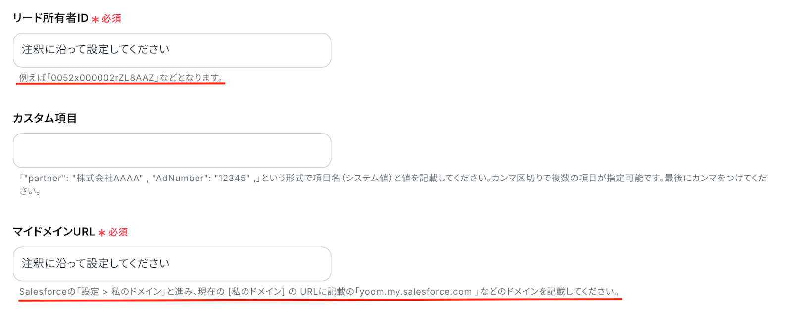 「リード保有者ID」と「マイドメインURL」は入力欄下の注釈を参考にして入力してください。
