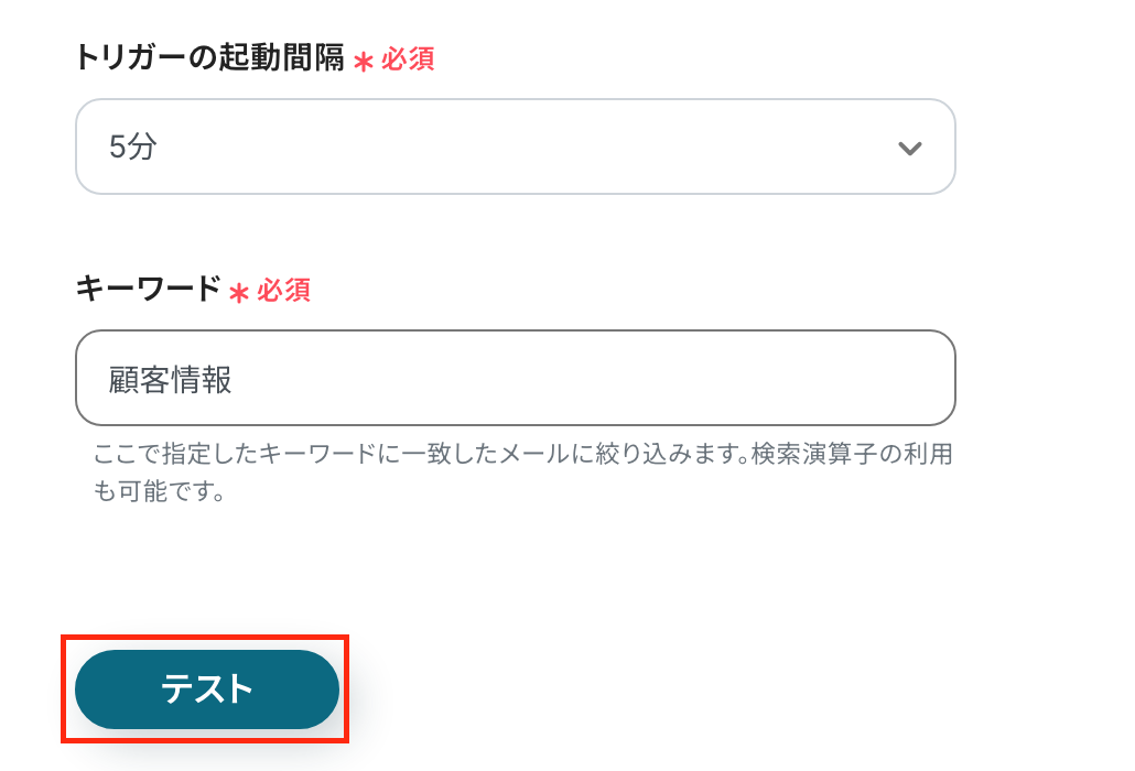 「キーワード」は先ほどテスト送信したメールの文章に含まれているキーワードを入力しましょう。