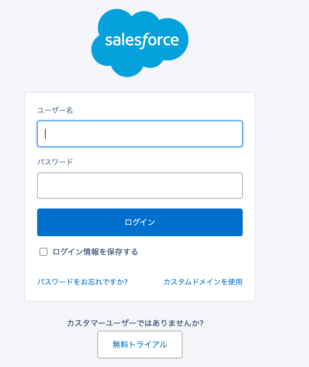 以下の画面が表示されたら、ユーザー名・パスワードを入力しログインしてください。 Yoomとの連携にはSalesforce側でも一部設定が必要です。 Salesforce側での設定手順はこちら をご確認ください。 ※Salesforceは一部有料プランでのみご利用いただけるアプリで、2週間の無料トライアルを行うことが可能です。