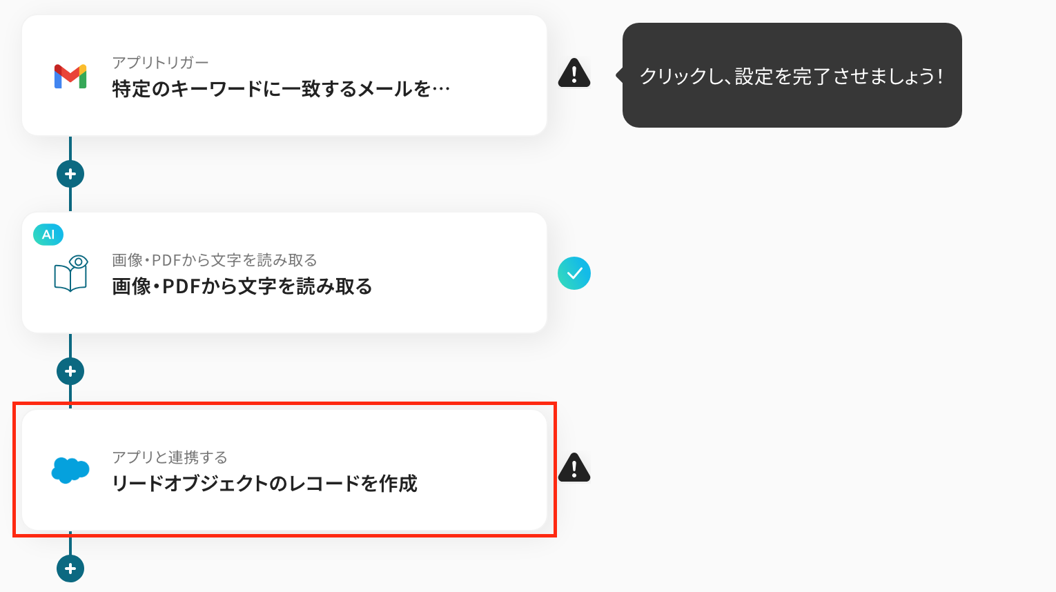 ■概要 このワークフローでは、Gmailの添付ファイルをOCRで読み取り、Salesforceでリードを登録することが可能です。このワークフローを活用することで、効率的かつ正確なデータ管理が可能になります。 Yoomを利用すると、プログラミング不要で簡単にアプリ同士を連携することができます。 ■このテンプレートをおすすめする方 ・Gmailを活用しており、添付ファイルからSalesforceへのデータ入力に手間を感じている営業担当者の方 ・Salesforceでのリード管理を効率化し、営業活動をスムーズに進めたい営業チームのリーダーの方 ・OCR技術を用いて、紙ベースや画像形式のデータをデジタル化し、業務プロセスを自動化したいIT担当者の方 ・RPAやAPI連携を利用して、既存の業務フローにYoomを組み込み、業務効率を向上させたい企業のマネージャーの方 ・手動でのデータ入力によるヒューマンエラーを減らし、正確なリード情報を維持したいビジネスオーナーの方 ■注意事項 ・Gmail、SalesforceのそれぞれとYoomを連携してください。 ・トリガーは5分、10分、15分、30分、60分の間隔で起動間隔を選択できます。 ・プランによって最短の起動間隔が異なりますので、ご注意ください。 ・Salesforceはチームプラン・サクセスプランでのみご利用いただけるアプリとなっております。フリープラン・ミニプランの場合は設定しているフローボットのオペレーションやデータコネクトはエラーとなりますので、ご注意ください。 ・チームプランやサクセスプランなどの有料プランは、2週間の無料トライアルを行うことが可能です。無料トライアル中には制限対象のアプリを使用することができます。 ・OCRのAIオペレーションはチームプラン・サクセスプランでのみご利用いただける機能となっております。フリープラン・ミニプランの場合は設定しているフローボットのオペレーションはエラーとなりますので、ご注意ください。 ・チームプランやサクセスプランなどの有料プランは、2週間の無料トライアルを行うことが可能です。無料トライアル中には制限対象のアプリやAI機能(オペレーション)を使用することができます。