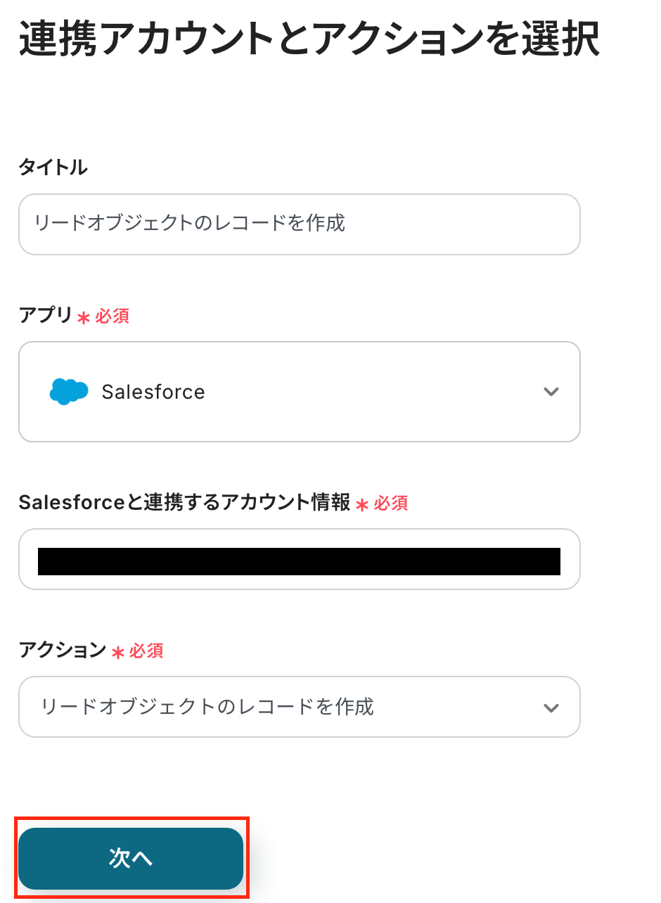 クリックすると以下のような画面に移ります。 タイトルとアクションを任意で設定し、連携するアカウント情報を確認し「次へ」をクリックして進んでくださいね。