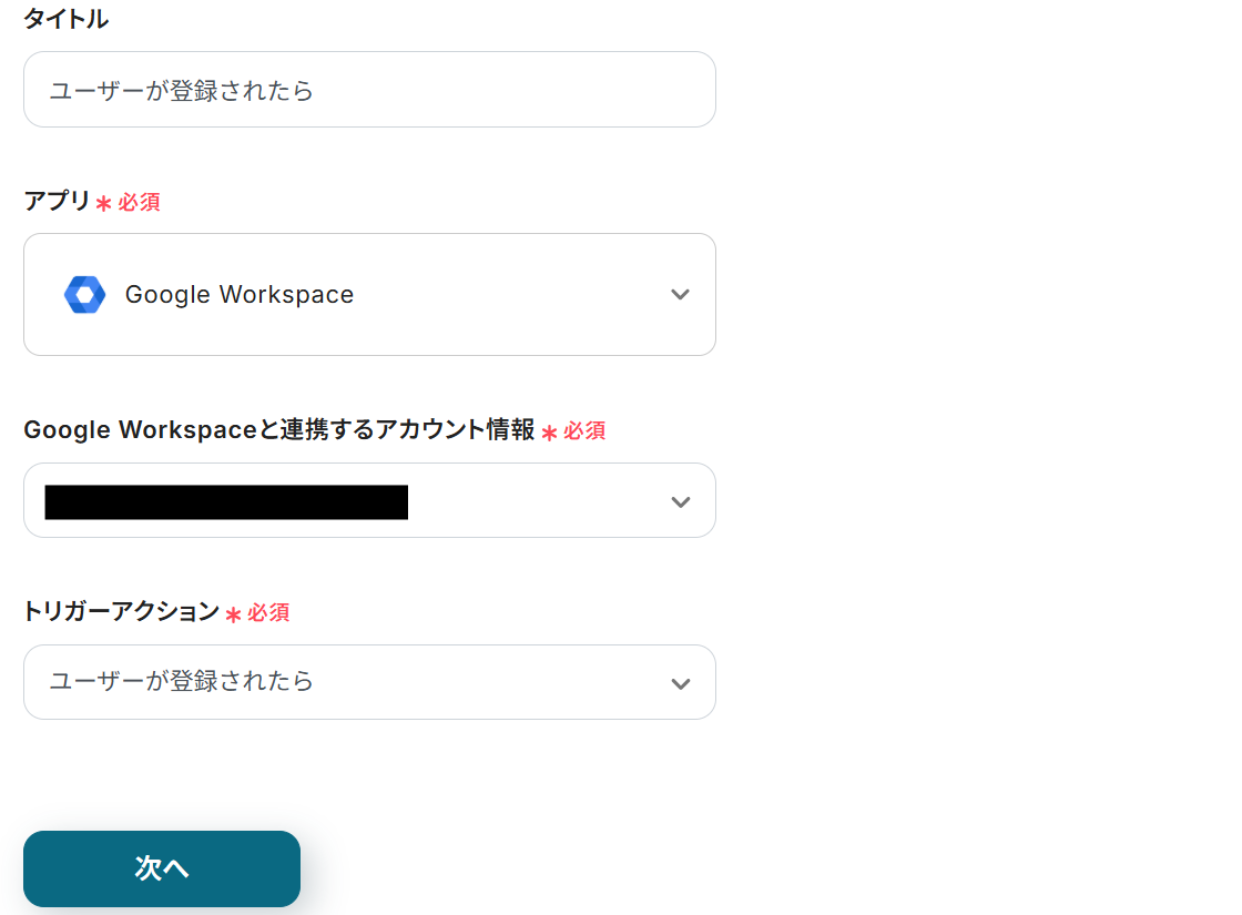 タイトルと連携するアカウント情報を任意で設定し、アクションはテンプレート通りのまま「次へ」をクリックして進んでください。