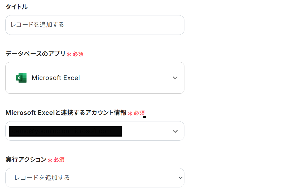 タイトルと連携するアカウント情報を任意で設定し、アクションはテンプレート通りのまま下にスクロールしてください。