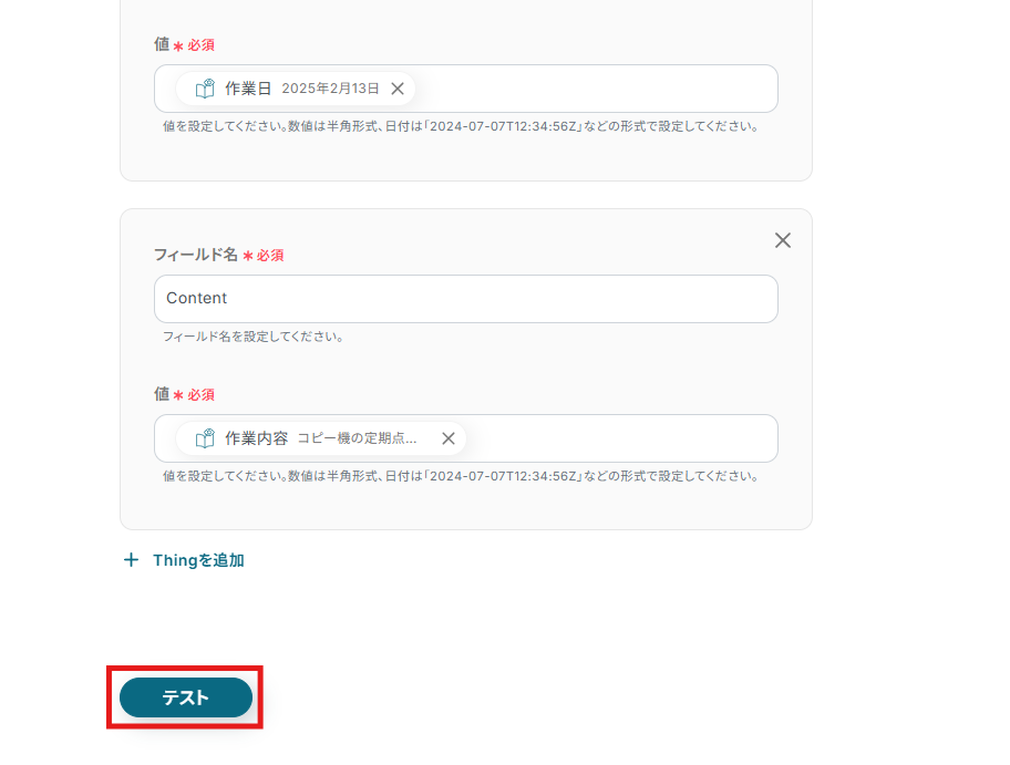(5)全ての設定が完了したら、「テスト」をクリックしてBubbleにThingを作成してみましょう。
