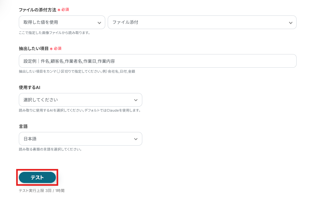 (7)設定が完了したら、「テスト」をクリックしてフォームの回答にあった画像やPDFの内容を読み取りましょう。