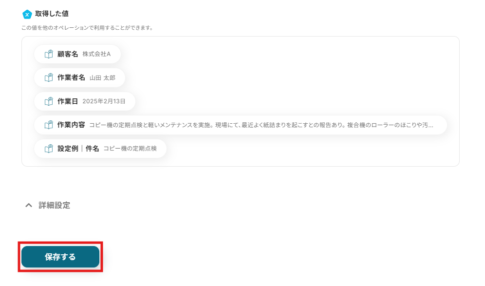 (6)「取得した値」に仮のファイルを設定し、「保存する」をクリックして設定完了です。