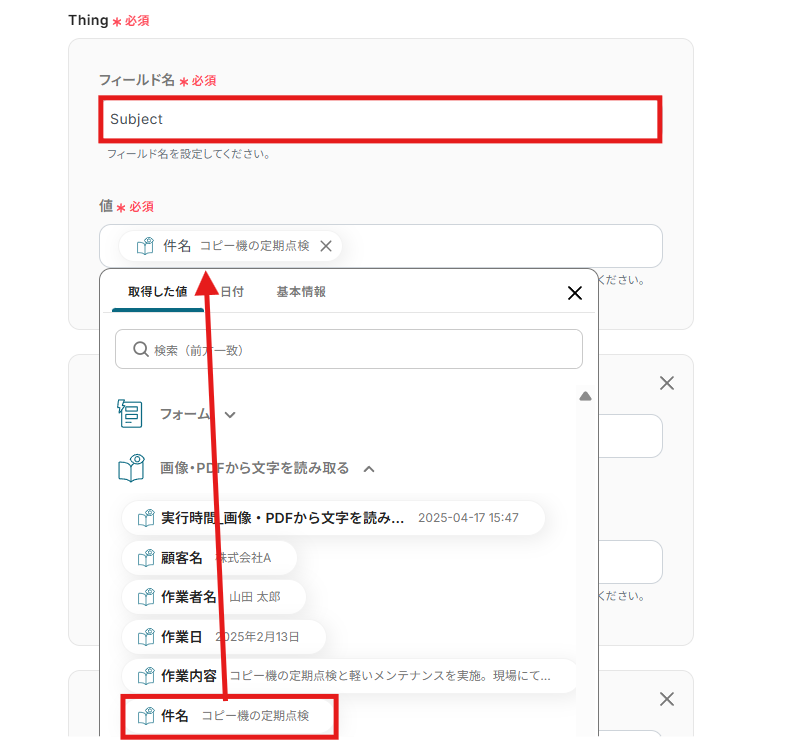 「フィールド名」を任意に入力し、「値」に適切な項目を設定しましょう。なお、「値」では「取得した値」からフォームの回答内容を引用できます。