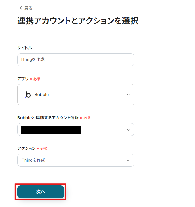 (2)Bubbleと連携するアカウント情報を任意で設定し、アクションはテンプレート通りに「Thingを作成」のまま「次へ」をクリックして進んでください。