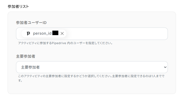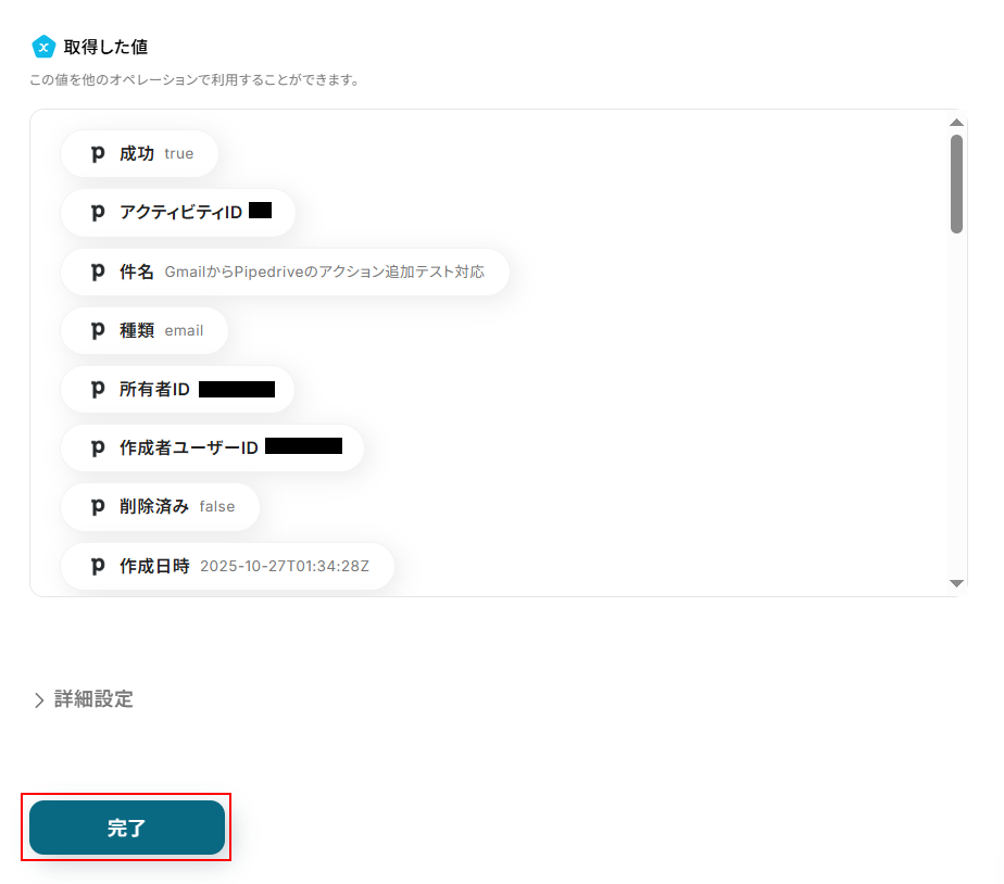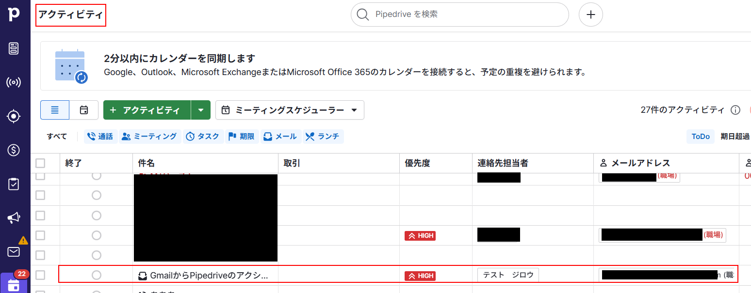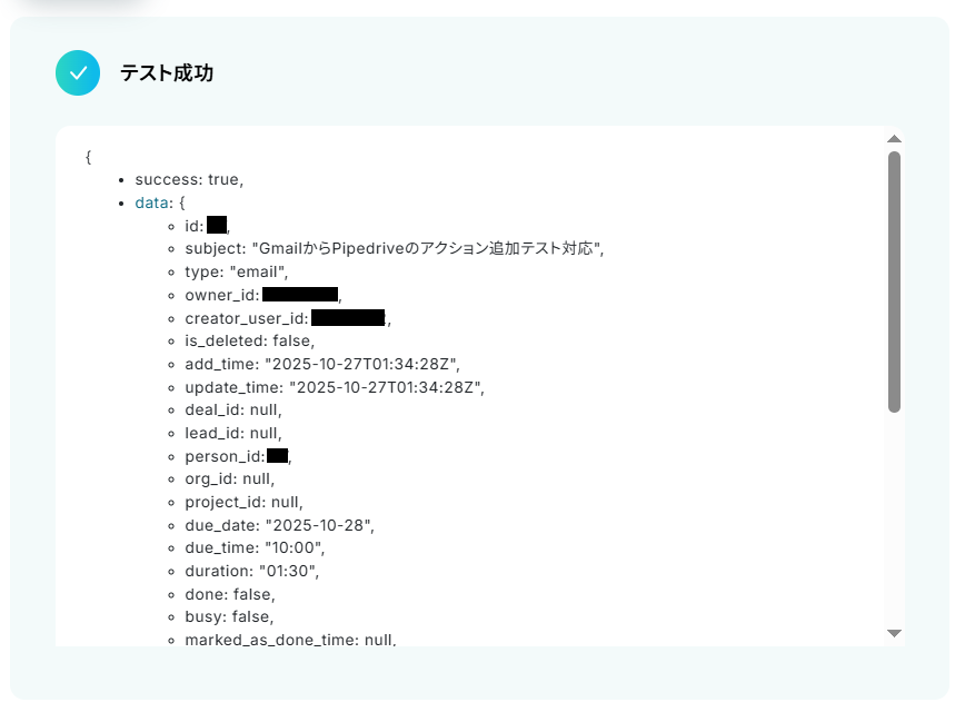 また、実際にPipedriveにアクティビティが作成されますので確認してください。