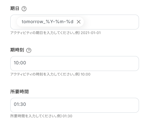 また直接入力すると入力した値が固定値となり、このテンプレートを通して作成される全てのアクティビティに反映されますのでご注意ください。