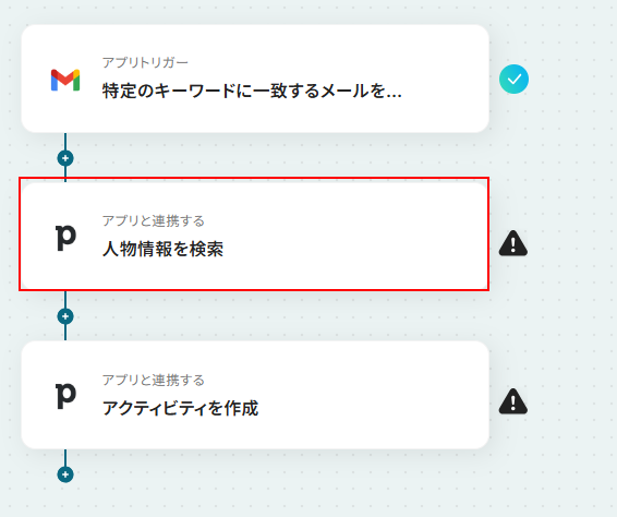今回ご紹介するテンプレートでは、Gmailの受信情報からPipedriveに登録している人物の情報を検索し、ヒットした人物にアクションを追加するといったように進みます。