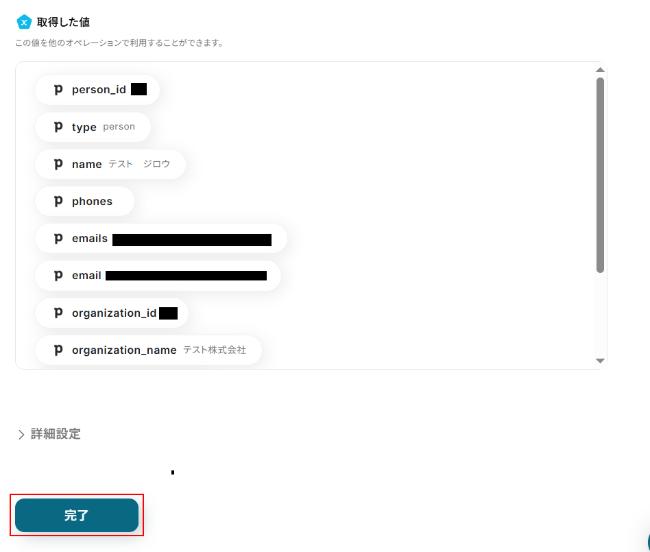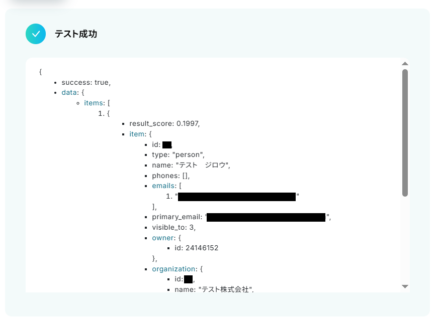 テストに成功するとテスト成功画面と取得した値が表示されますのでご確認ください。