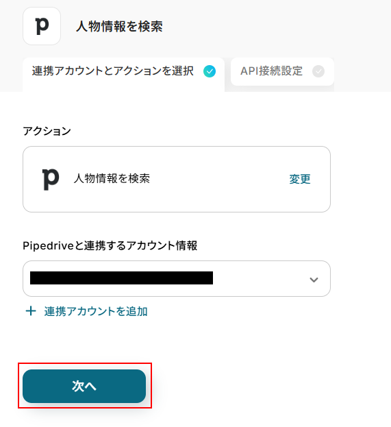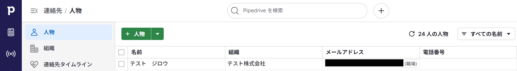 そのため、実際にテストを行うには、まずPipedriveに任意のメールアドレスを持つ人物を登録する必要があります。