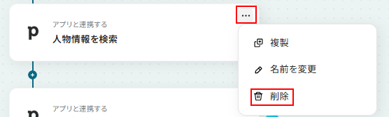 別のアプリに変更したい場合は、以下のようにフローボットの…の箇所をクリックし、削除を選択することでPipedriveのアクションを削除できます。
