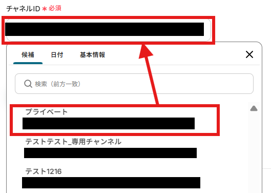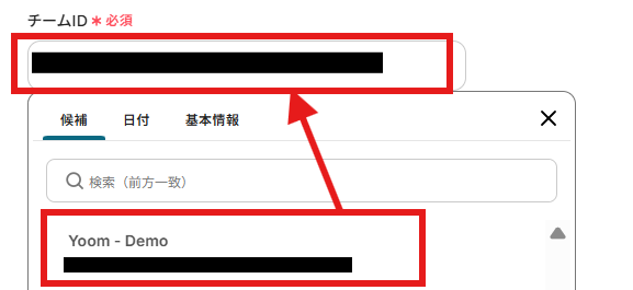 メッセージを感知したいチャネルを指定していきます。まずはチームIDを候補より選択しましょう。