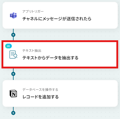 ステップ4:AIでデータを抽出する 次にAIで受信したメッセージのテキストからデータを抽出していきます。 「テキストからデータを抽出する」をクリックしてください。AIを使用した「データの抽出」アクションの設定方法 もあわせてご確認ください。