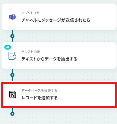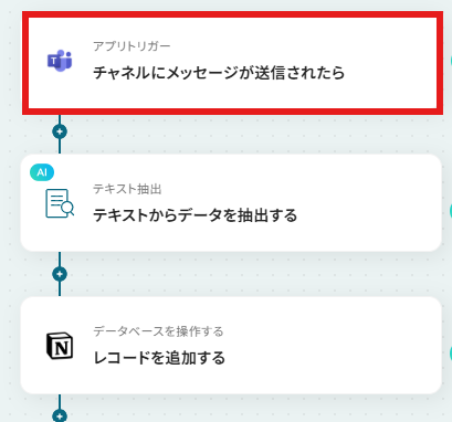 はじめに、Microsoft TeamsとNotionをYoomと連携します。 次に、トリガーでMicrosoft Teamsを選択し、「チャネルにメッセージが送信されたら」というアクションを設定します。 次に、オペレーションでAI機能を選択し、「テキストからデータを抽出する」を設定し、投稿されたメッセージから必要な情報を抽出します。 最後に、オペレーションでNotionの「レコードを追加する」アクションを設定し、抽出したデータを指定のデータベースに追加します。 ※「トリガー」:フロー起動のきっかけとなるアクション、「オペレーション」:トリガー起動後、フロー内で処理を行うアクション