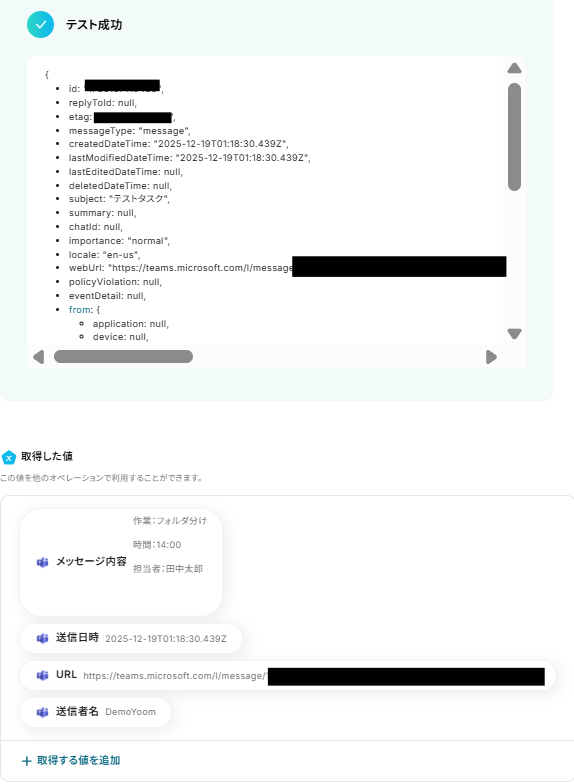 ※取得した値とは? 取得した値とは、トリガーやオペレーション設定時に、「テスト」を実行して取得した値のことを指します。 取得した値は、後続のオペレーション設定時の値として利用でき、フローボットを起動する度に、変動した値となります。詳しくは以下をご覧ください。