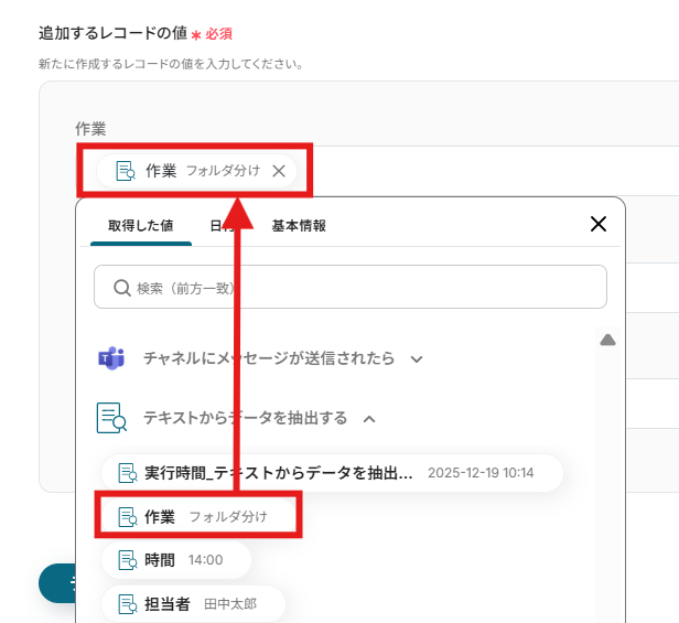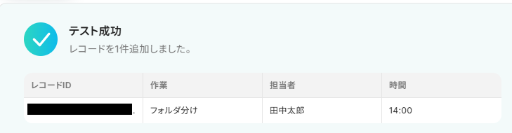 前ページでデータベースがうまく指定できていれば、「追加するレコードの値」にNotionデータベースの項目が反映されています。(作業、担当者、時間)
