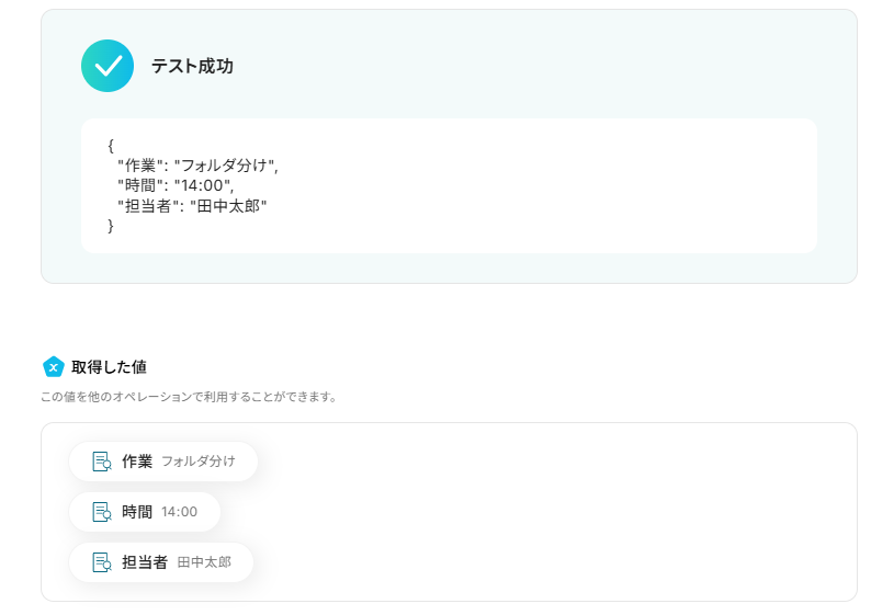 テストが成功し、きちんと抽出が行えているようならOKです。もし抽出がうまくいかない場合は、具体的な指示内容を足して再度テストしてみてください。