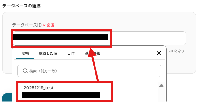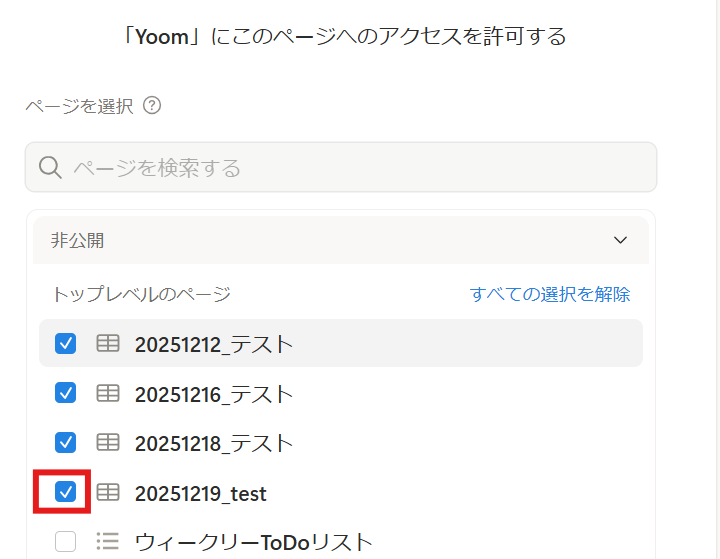 もし候補に表示されない場合は、ひとつ前の手順の「連携アカウントを追加」から、連携アカウントを再接続し、Yoomにページの権限を許可してください。すると候補に表示されます。