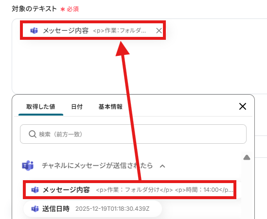 「対象のテキスト」は前のステップで受信したメッセージの内容を、取得した値から指定します。 取得した値を活用することで、固定値ではなく、トリガーが実行されるたびに最新の情報が反映できます。