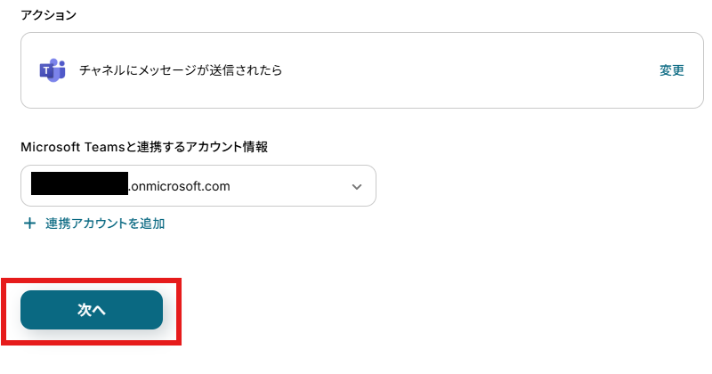 アクションはデフォルト設定のまま、アカウント情報は、連携したいアカウントが選択されているか確認してください。