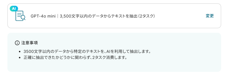 今回使うのは「GPT-4o mini|3,500文字以内のデータからテキストを抽出(2タスク)」です。文章量などによってこちらは適宜変更してください。