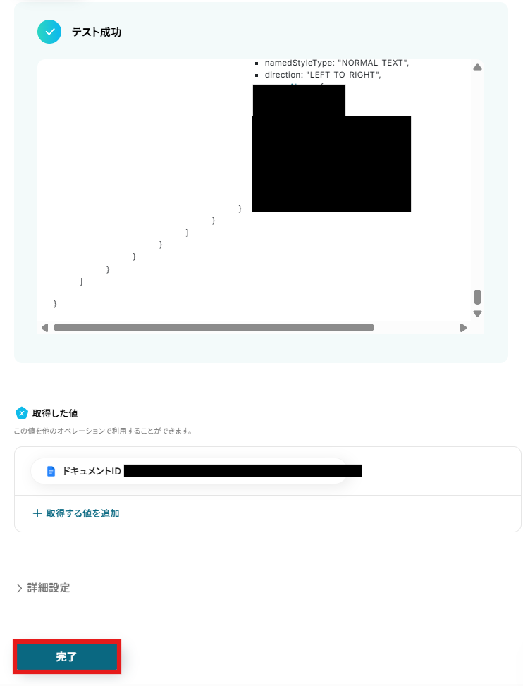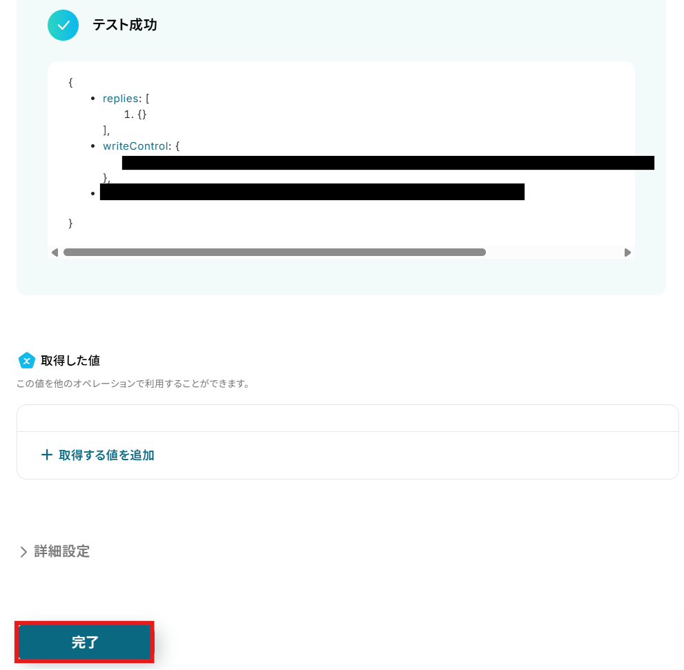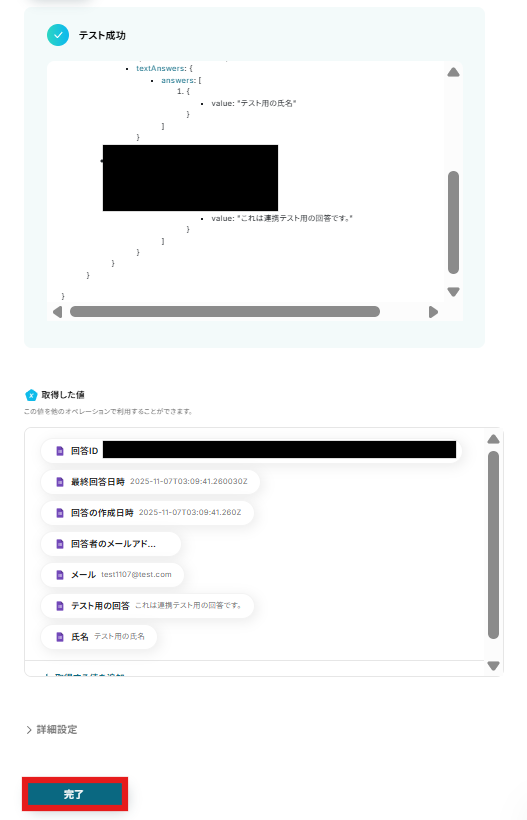 取得したい項目を追加できたら「完了」で設定を保存し、アプリトリガーの設定完了です!