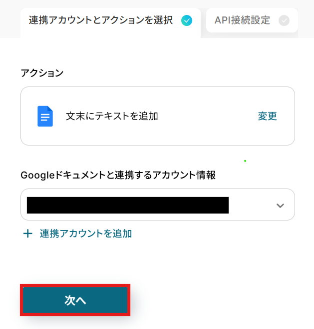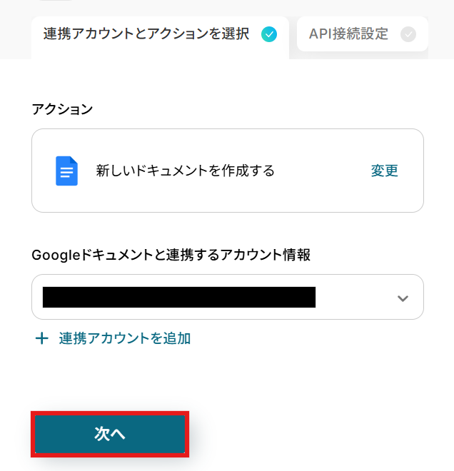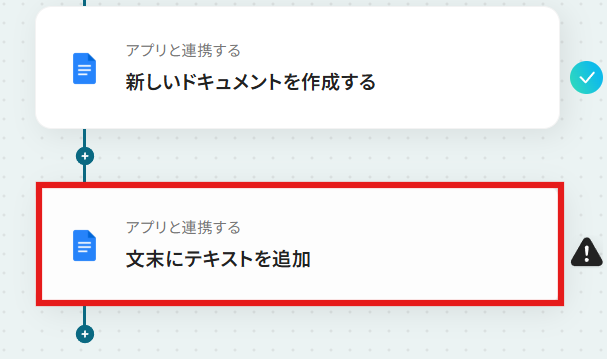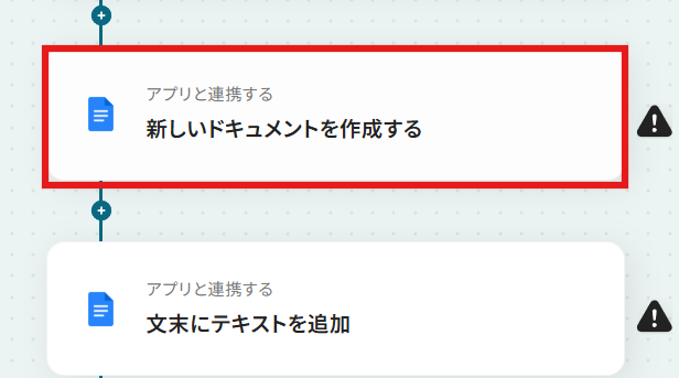 次に、Googleドキュメントで新しいドキュメントを作成するアクションの設定を進めていきましょう。