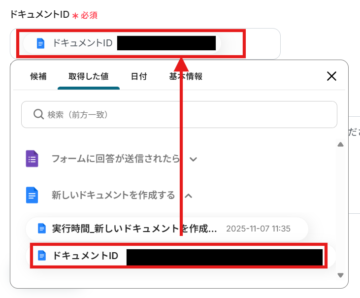 その場合はドキュメントを作成するアクションを削除し、文末にテキストを追加するアクションで任意のドキュメントIDを指定してください。