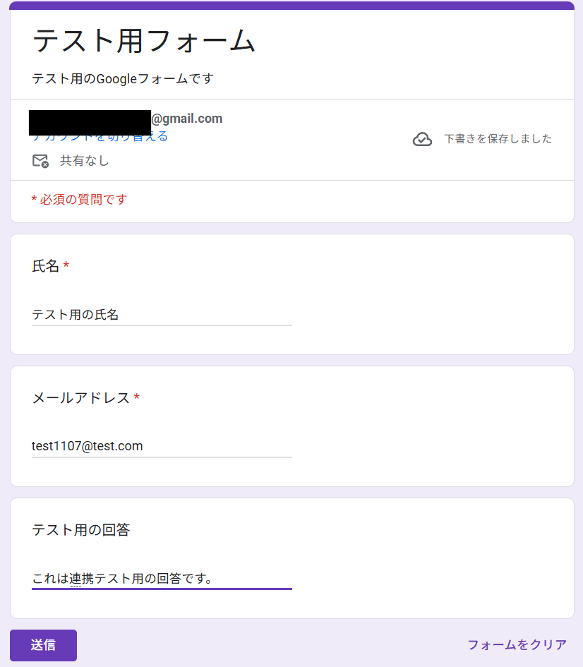この後行う連携テストで使用するGoogleフォームを用意し、回答の送信までしておきましょう。