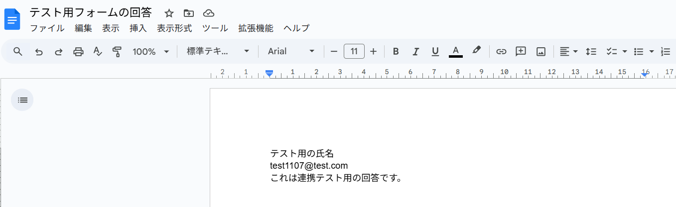 テストが成功すると、作成したGoogleドキュメントにテキストが追加されていますので、確認してみてください。