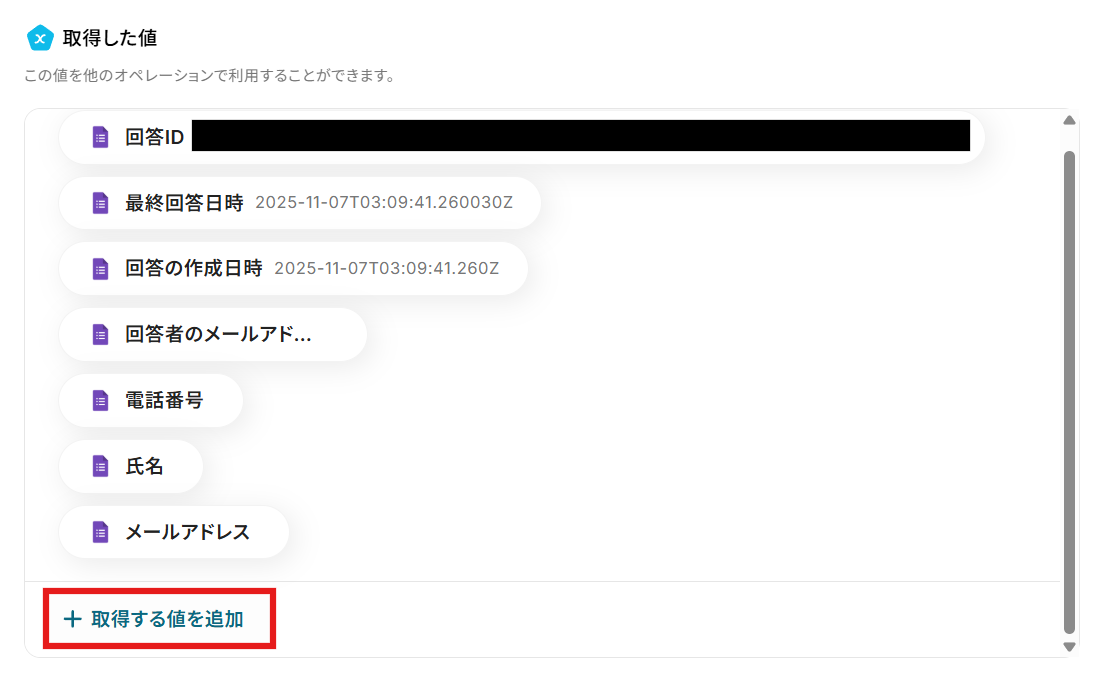 また、YoomのGoogleフォームでは、デフォルトで取得できる値は「回答ID」「最終回答日時」「回答の作成日時」「回答者のメールアドレス」のみとなっており、ユーザーの回答内容を取得するためには、手動で追加する必要があります。