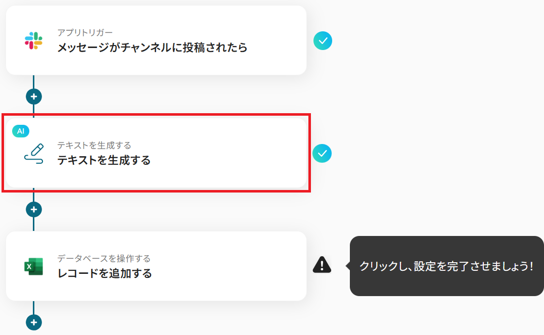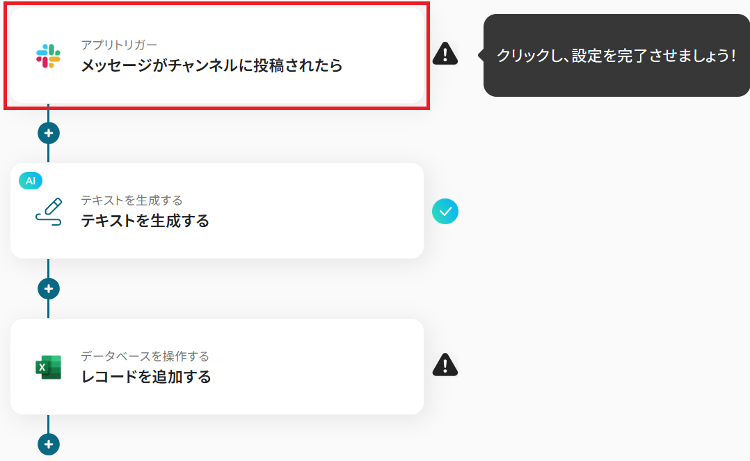 それではここから代表的な例として、Slackの特定チャンネルにメッセージが投稿された際に、その内容をAIが自動で整理し、Microsoft Excelの指定したシートにデータを入力するフローを解説していきます!