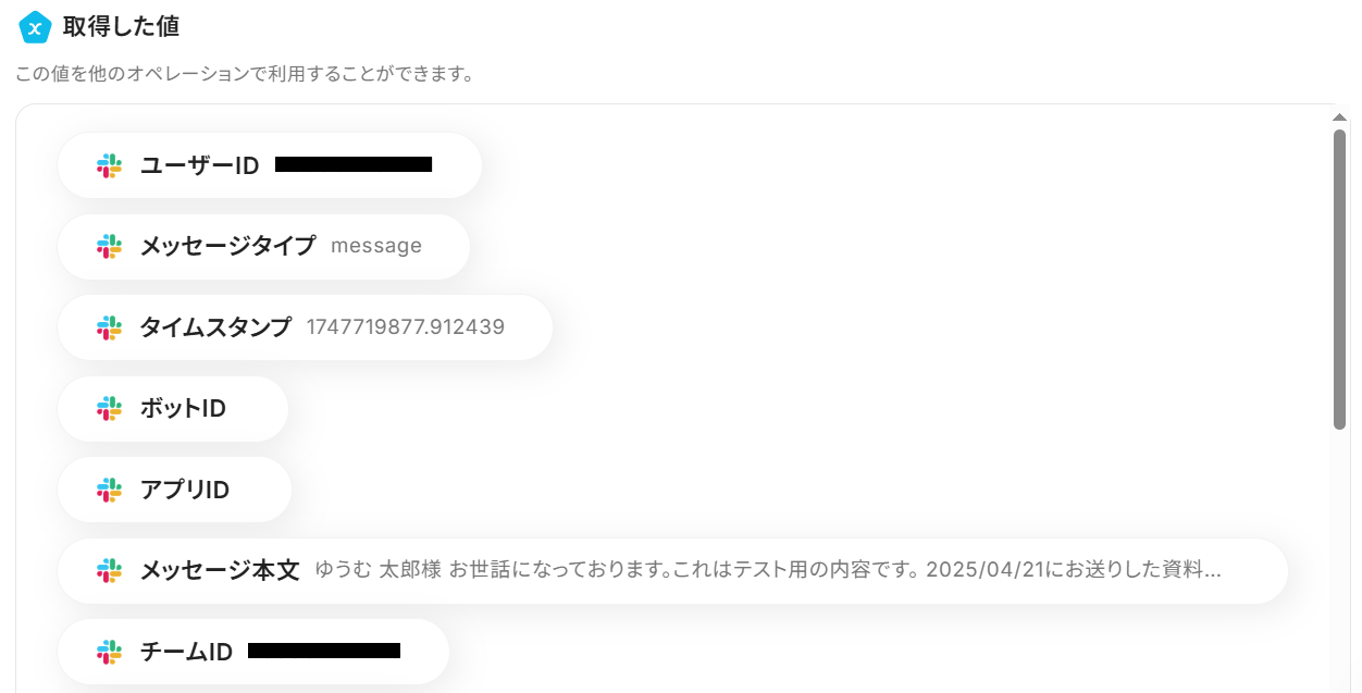 以下のようにアウトプットを選択すると、ステップ3で取得したSlackの項目や、ステップ4で取得したAIによる抽出内容を反映させることができます。